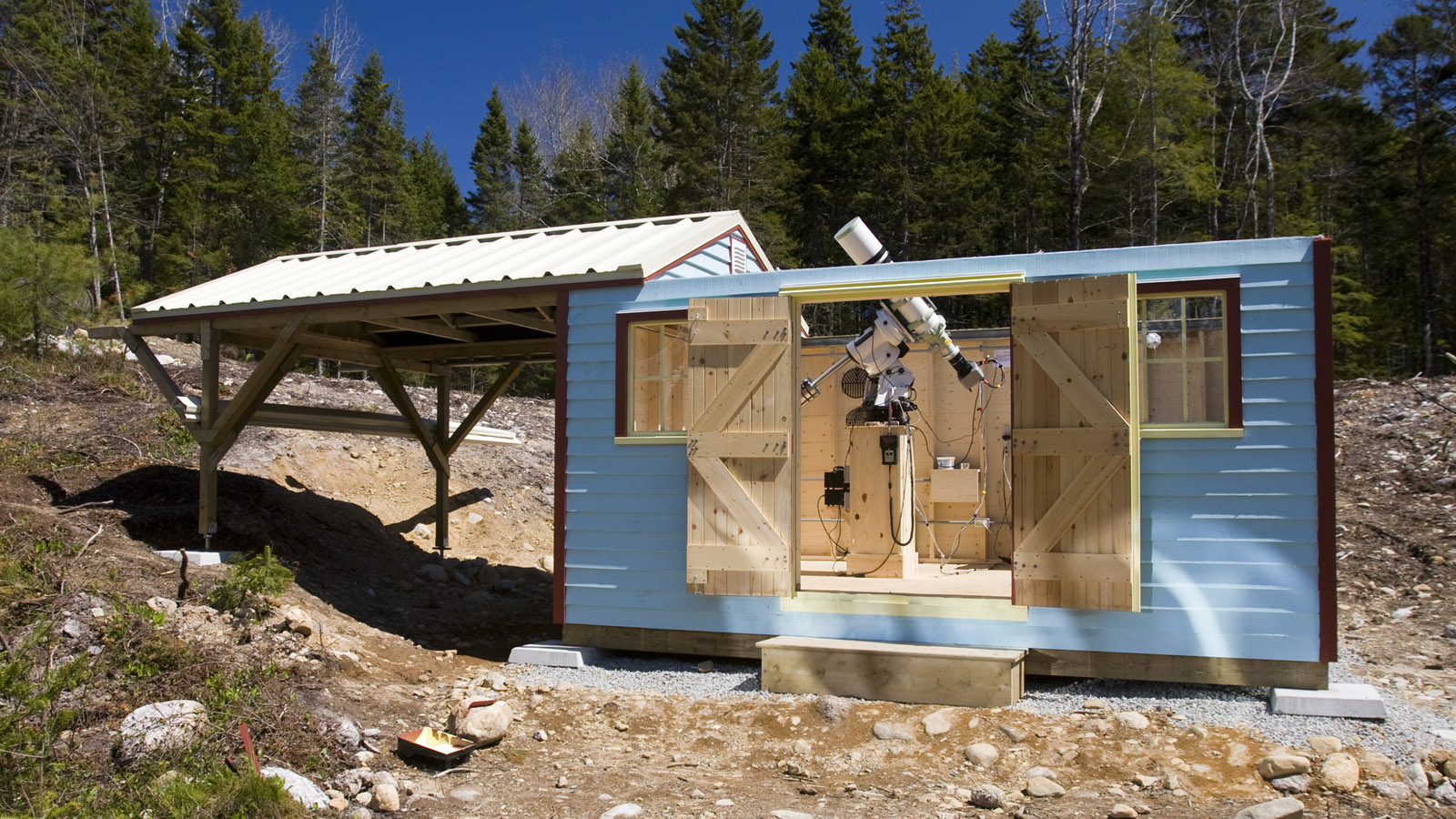 The observatory was completed in late fall, 2013. It is pictured here in Spring 2014, after its first painting but prior to landscaping.