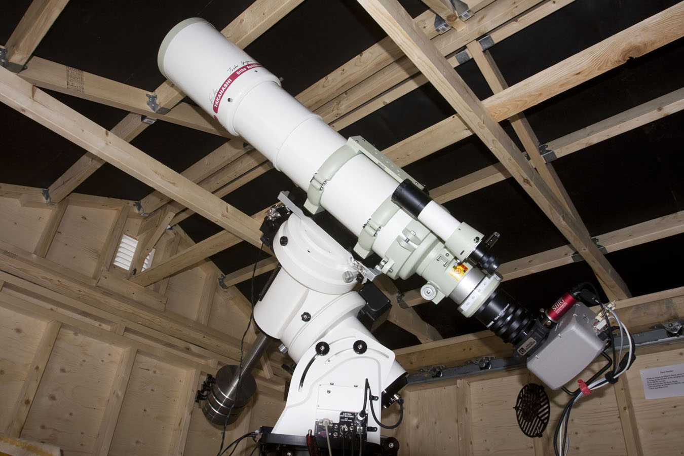 Some older images here were obtained using Canon camera lenses on a Losmandy G-11 mount. The observatory made it practical to use larger telescopes. Of the two Takahashi refractors pictured here, only one remains. The small FSQ-106EDXIII has the SBIG ST-8300M CCD camera mounted on it, long since replaced with an STL11002 mono CCD. The Takahashi TOA-150 in the image below was sold in Spring, 2022. The TOA-150 is shown on the Astro-Physics 1600GTO equatorial mount.