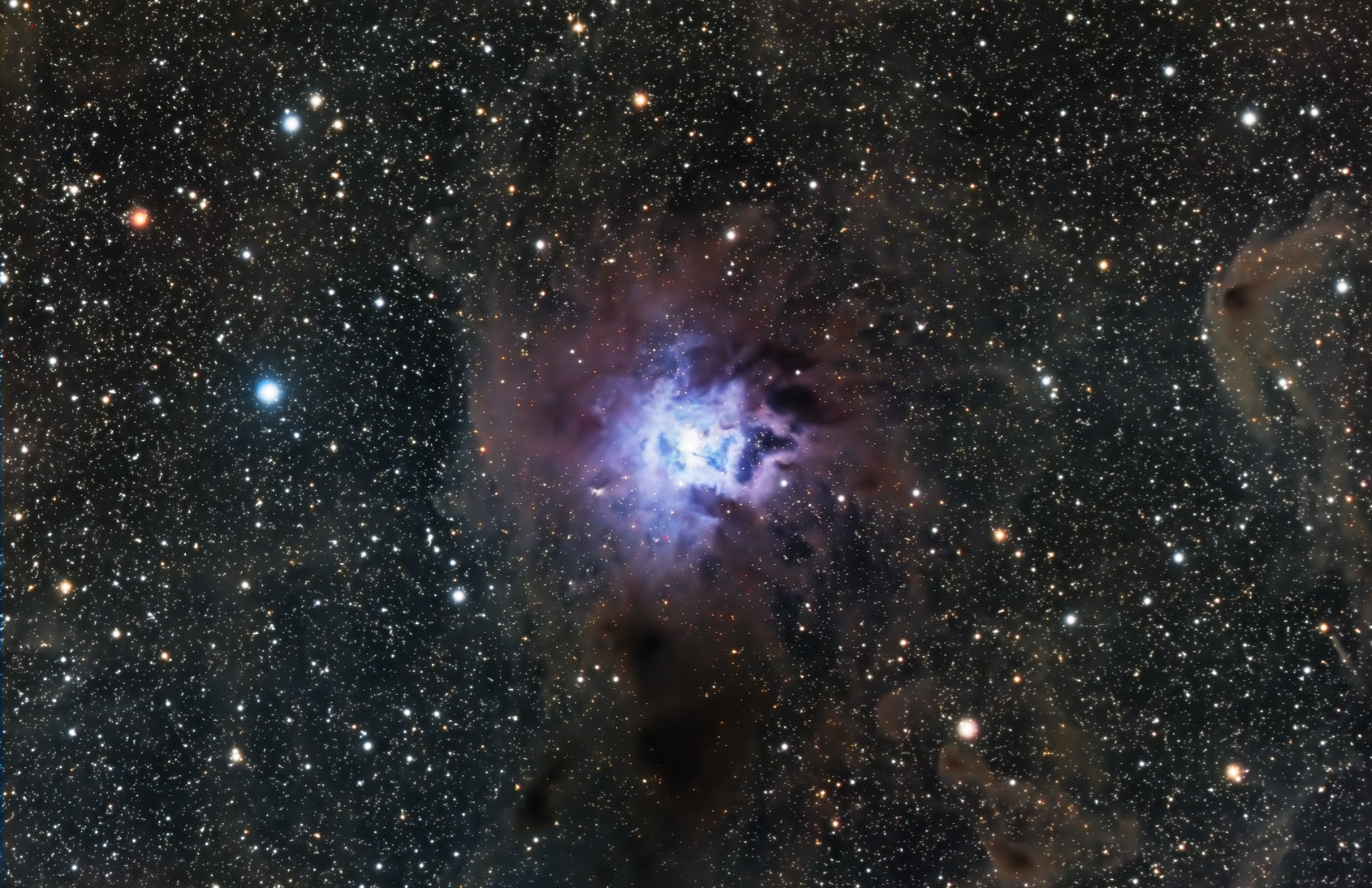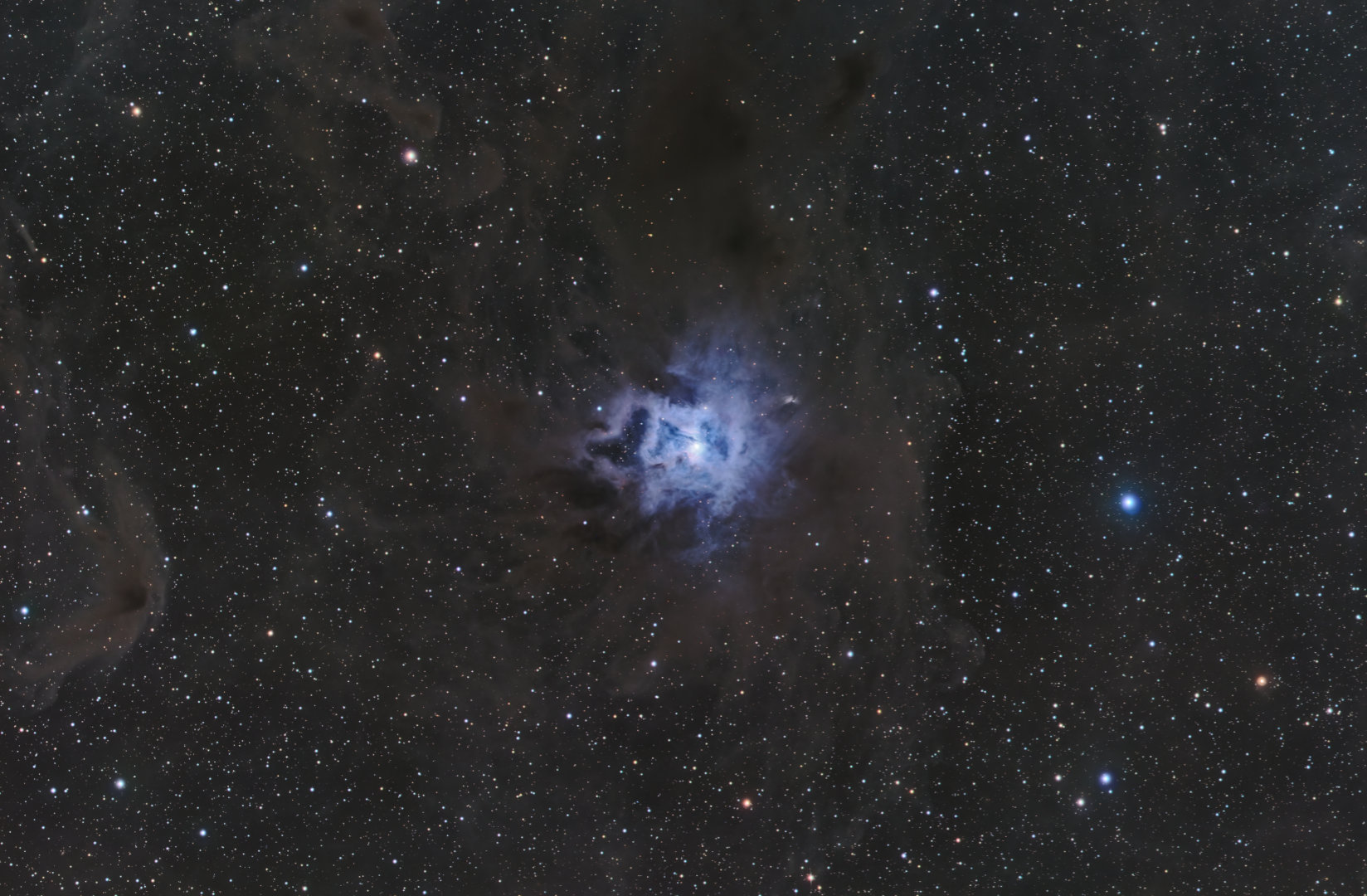 The Iris nebula is a cloud of dust, brightly illuminated by the blue light of nearby stars. Areas not directly illuminated appear as a dusty veil. Denser portions of the dust cloud appear black and blot out the light from stars lying in the background. The nebula is located approximately 1,300 light years from Earth.