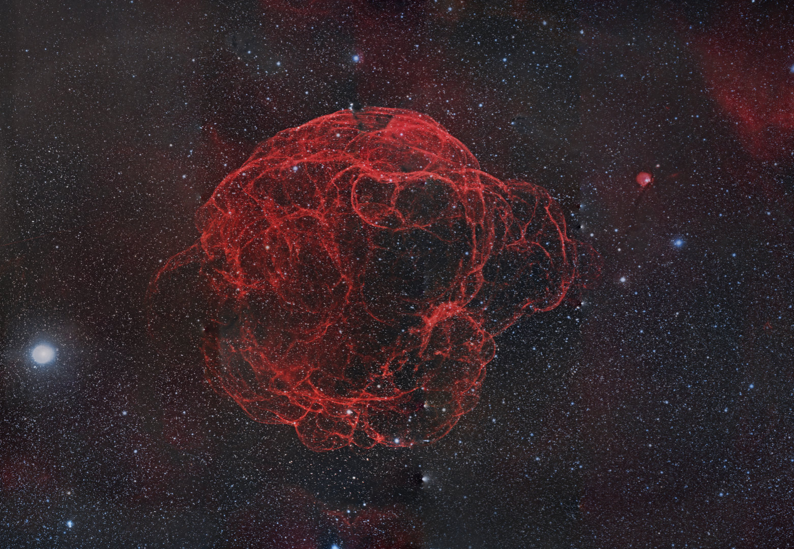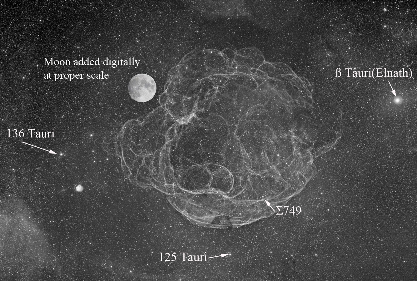 This is a very faint object swamped by the rich star fields along the border of Auriga and Taurus. Note how large an area this super nova remnant subtends on the night sky in comparison to the full moon, here added digitally for scale! Were only human eyes sensitive to the light of hydrogen alpha emission, we would readily see this knotted skein of fibrous tendrils glowing large in the night sky on moonless nights. As it is, the object is invisible to the eye even in telescopes! It bears the name Simeis147 or Simeiz147 from its entry in a catalogue compiled by the Crimean Astrophysical Observatory, located at Simeis in the Ukraine, at which it was discovered. Despite its huge apparent size on the night sky, it is so faint, and so ensnarled in the rich field of stars surrounding it, that it was discovered on red-sensitive photographic plates only in 1952! It is the expanding remnant of a star which exploded some 40,000 years ago. Its progenitor star, reduced to a pulsar, hides in its core. This sprawling supernova remnant lies some 3,000 light years distant from earth.